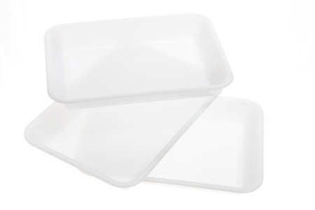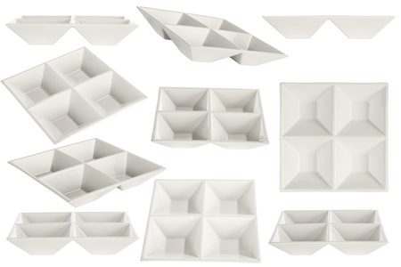 A set of disposable white plastic plates on a clean surface, arranged in an orderly manner.