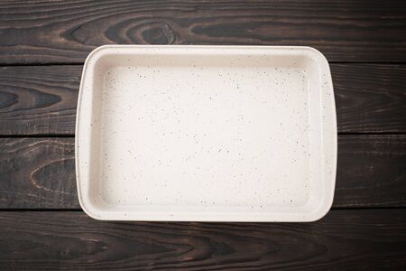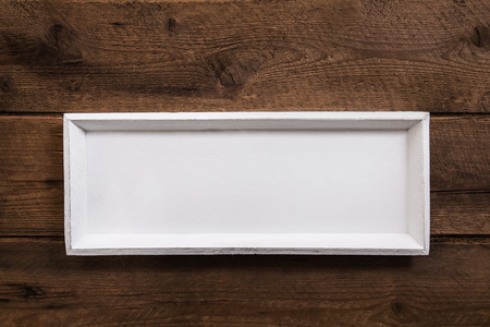 Empty white rectangular plates on brown rustic wooden background, flat lay. Generative AI