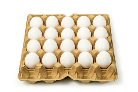Top view of white eggs in the cardboard egg tray with rooms for twenty eggs isolated on white background, with clipping path included