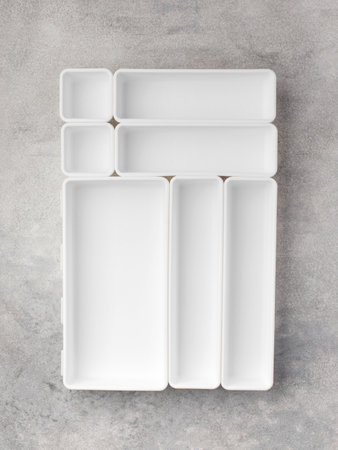 A set of plastic containers, boxes for convenient storage inside a drawer in the kitchen and at the desk.