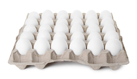 An isolated tray of eggs from recycled materials with 30 white eggs on a white background. Top view