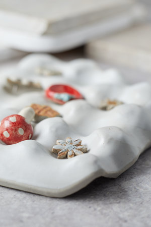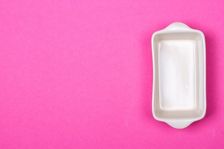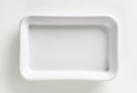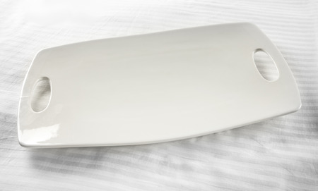 Ceramic tray isolated on white background. Serving plate. Classic beige design. Top view. Meal preparation.