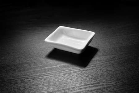 Ceramic bowls for sushi food on the yellow and white wooden table