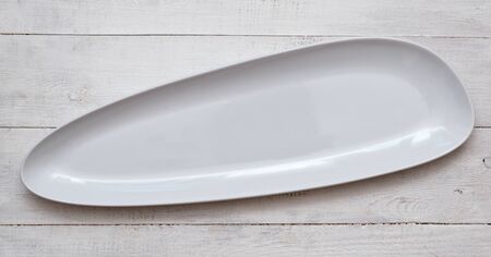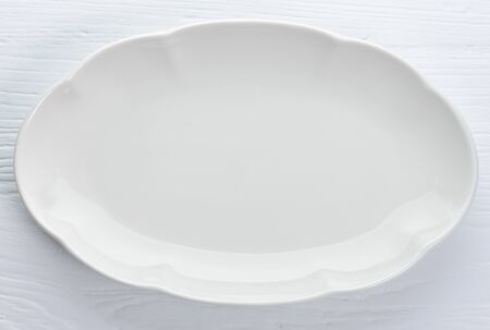Empty white plate on white wooden table. Top view. Mockup for food project