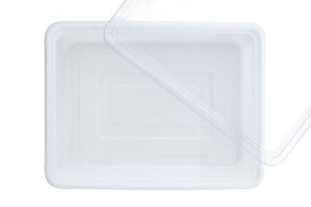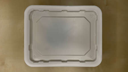 folded white transparent plastic container.stack of plastic containers, boxes.Say no to plastice text and plastice package. Concept of eco pollution.Selective focus