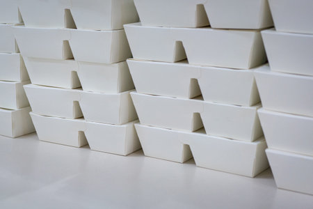 A set of white plastic disposable plates stacked with subtle light and shadow play, perfect for events.