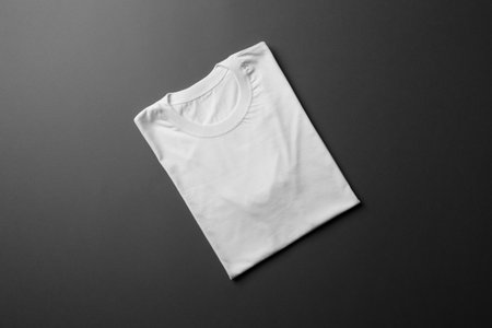 White t-shirt mockup showing a blank space for branding or design, presenting a clean cotton fabric texture on a dark gray concrete table, perfect for advertising and fashion concepts