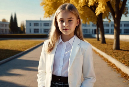 Art noise film style image. Portrait of thirteen-year-old schoolgirl in white blouse, plaid skirt and jacket at school. Emotional teen girl posing looking at camera. Concept of school age and learning