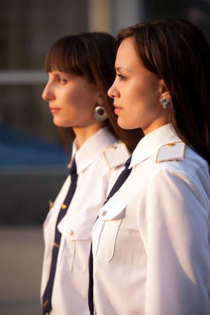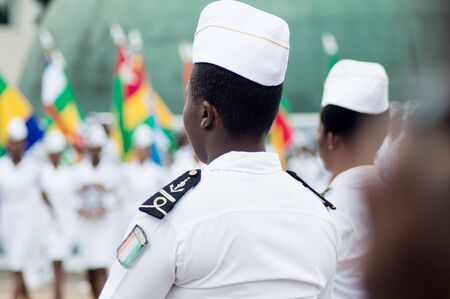 Abidjan, Ivory Coast - August 3, 2017: shoulder pad ceremony to students leaving the Maritime Academy. group of women sailors dressed in white standing during graduation