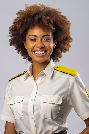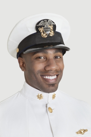 Portrait of a young African American US Navy officer smiling over gray background