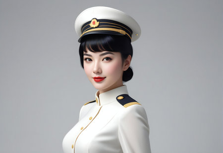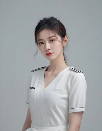 beautiful asian woman in white uniform, isolated on gray background