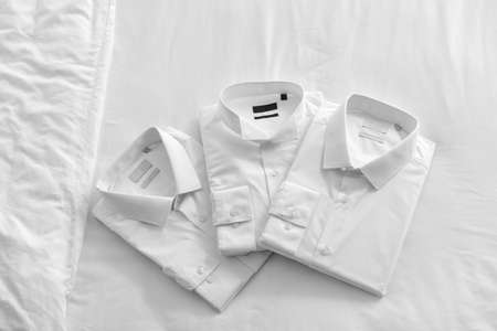 Folded shirts after dry-cleaning on bed
