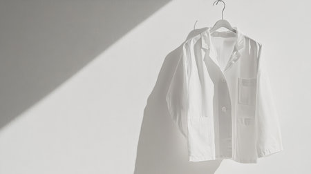 A white coat is elegantly hanging on a hanger, softly illuminated by natural light, casting gentle shadows on a pale wall, emphasizing simplicity and style.