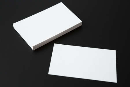 High-angle view of a fan stack of business cards on a white textured paper background, minimalistic design