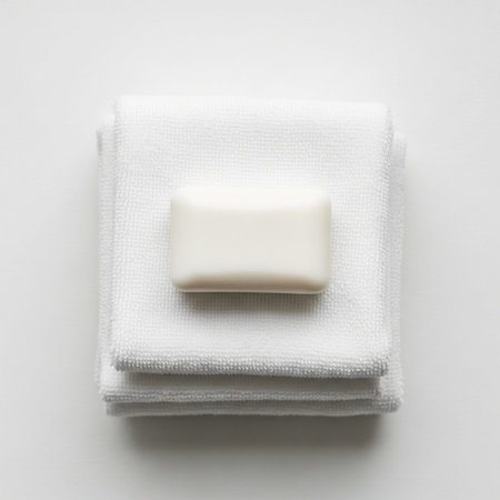 Pristine white linen towels stacked with unscented soap bar in an aerial flat lay, symbolizing spring cleaning, purity, and a fresh start.