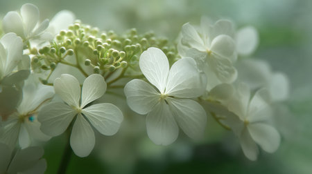 This close-up image features delicate white hydrangea blossoms against a soft green background, highlighting the intricate details of each petal.