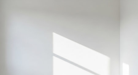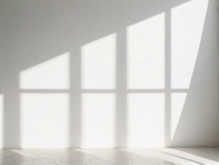Soft sunlight shadows on white wall. Minimalist interior detail with natural light and clean lines. Architectural texture for design or meditation themes. Real photo