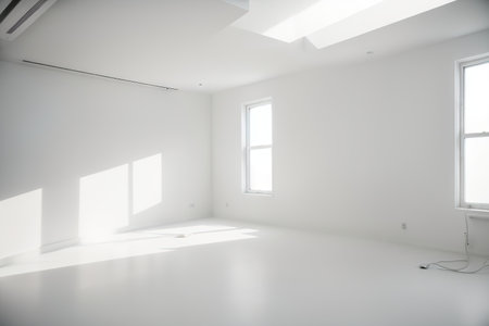 A spacious and bright interior showcasing large windows that let in abundant natural light, creating a serene and minimalist atmosphere perfect for various creative projects.