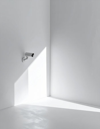 In a stark, minimalist white room, a lone security camera keeps a silent watch.