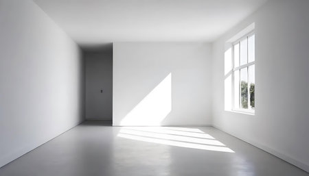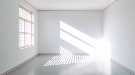 White wall and large window. Sunlight is streaming through window, casting long shadows on wall. Room is bright and airy, with clean, minimalist feel. Background for interior or product display. AI.