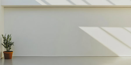 A minimalistic indoor area features a single potted plant next to a clean wall. Natural light streams through casting shadows that add depth to the serene environment.