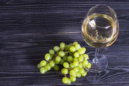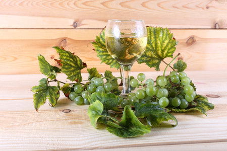 A glass of white wine with grapes on a barrel. White wine Riesling, from white grapes