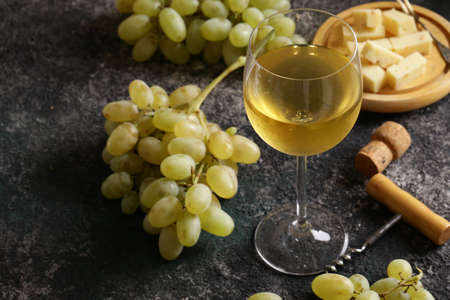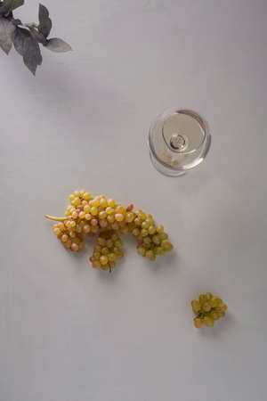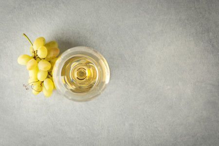 Elegant glass of white wine with a bunch of fresh green grapes in a bowl in a concept of wine making and viticulture on a grey background with copy space