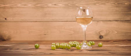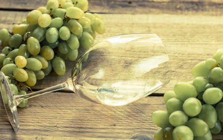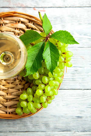 White wine glass on ripe bunch of grapes background in sunny day. Wineglass with golden grape sparkling drink on wooden rustic winery table top view