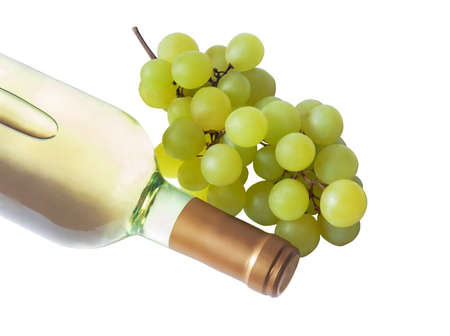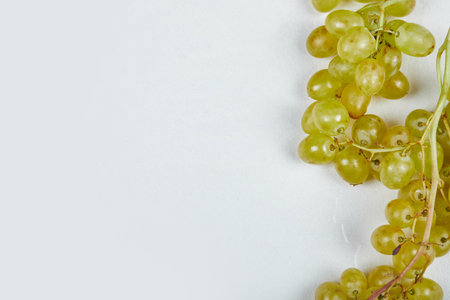 Vine leaves and bunch of grapes on an isolated white backdrop background. Text area for your messages.