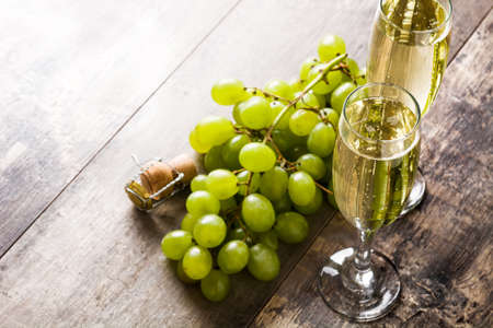 Glasses of white wine and white grape on wooden table top view. Wine composition with copy space for design.