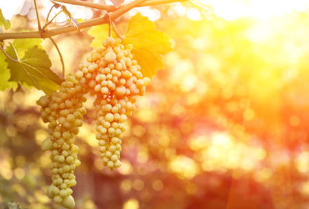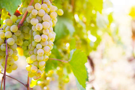 bunches of ripe white wine grapes hanging on vine in vineyard at harvest time with blurred background and copy space