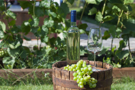 Wine glass with ice cold white wine, outdoor terrace, wine tasting in sunny day, green vineyard garden background and white grape