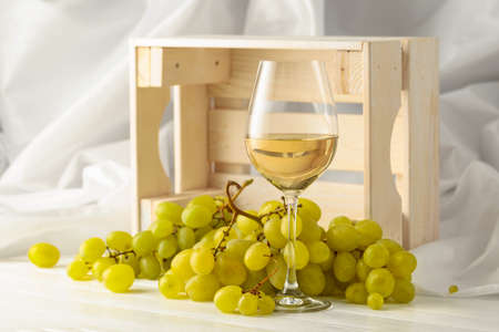 white grapes in a wine glass. White wine in a glass with fall grapes, white background, selective focus