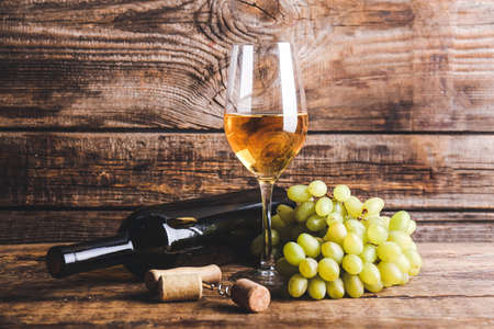 Wine background. White wine in glasses, bottle, grapes on vintage background, wine concept.