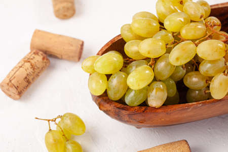 clusters of green grapes in a wooden plate on a white background with wine stoppers