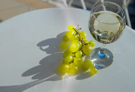 Glass of white wine, bunch grapes. Sun lught and shadow tropic background. Organic antioxidant beverage.
