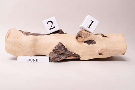 White cube calendar 21 June on wooden log