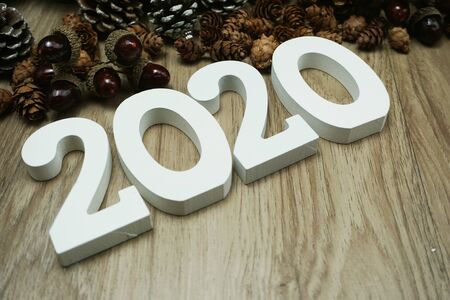 Happy New Year 2020 festive background pine cone decoration on wooden background