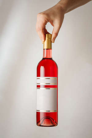 Male hand holding bottle of pink red wine, natural fruit alcohol liquor with empty label on gray background. Mock up, template for brand, copy space