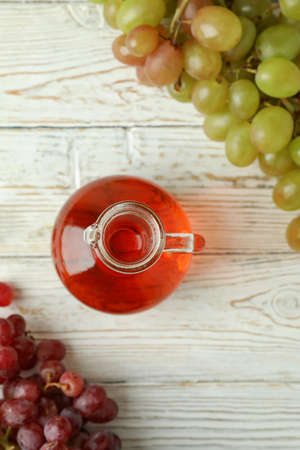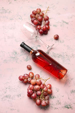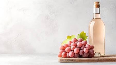 Bottle of rose wine and bunch of grapes on wooden board on light background