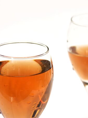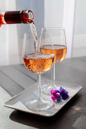 Pouring of rose wine from Provence in two glasses in spring sunny day