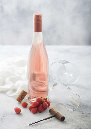 Bottle of pink rose wine with grapes and empty glass with corkscrew and linen cloth on light table background.