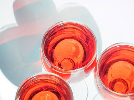 pink wine in glasses and bottle close up, top view with shadows overlay