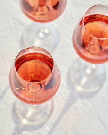 Rose wine of different shades in glasses on white background. Rosado, rosato or blush wines tasting