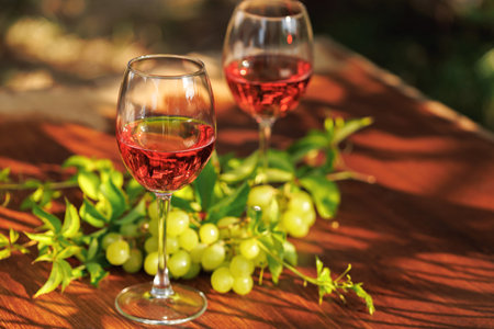 Two cold rose wine glasses served on outdoor terrace in garden with flowers in sunny day