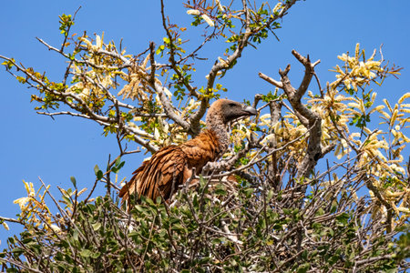 Griffon vulture or Eurasian Griffon or Gyps fulvus closeup or portrait perched on tree during winter migration at desert national park jaisalmer Rajasthan India