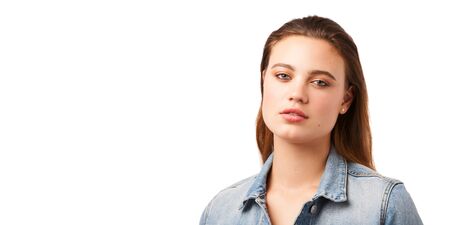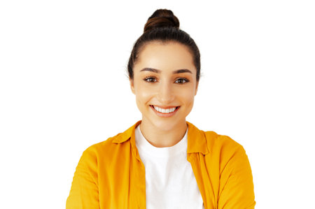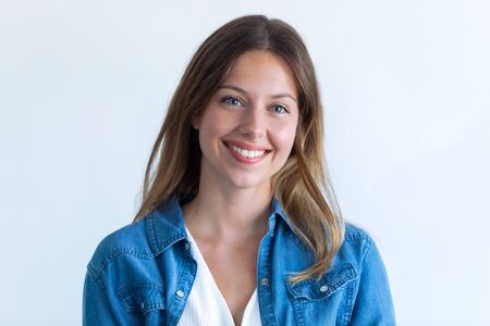 Portrait of happy young woman with perfect smile looking at camera. Isolated on white background.