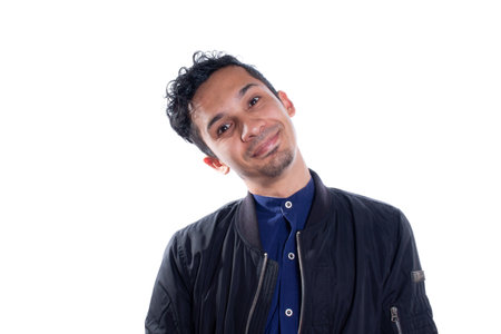 Man smiling, turning his face and staring at the camera. Isolated on white background. Young adult latin.