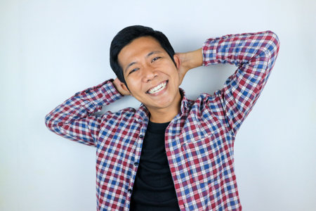 Smiling asian man with arm behind head relaxing peacefully in free time isolated on white background