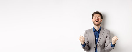 Excited man winning in cazino and celebrating, making fist pump and shouting yes with happy expression, achieve goal, triumphing, standing on white background